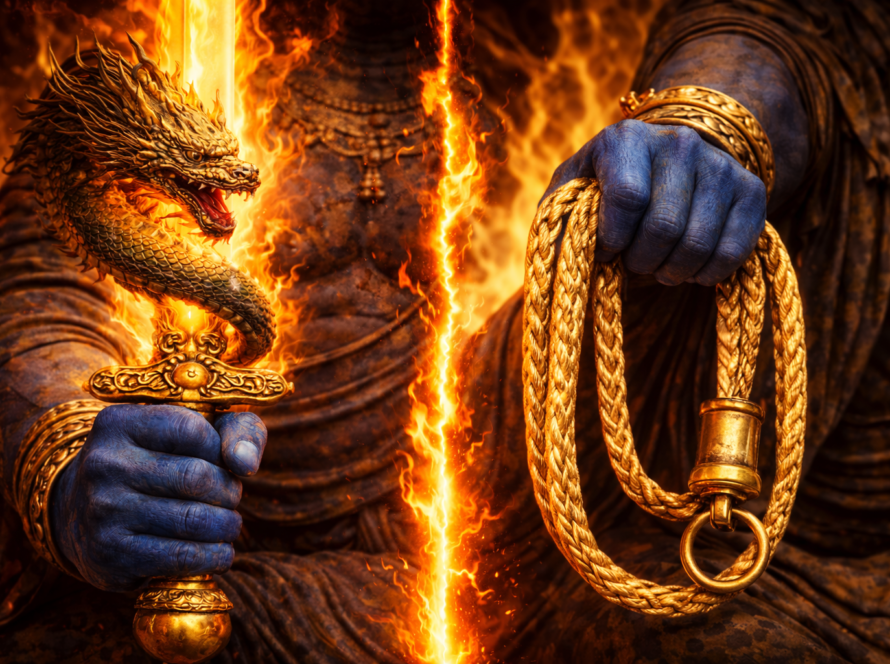 La iconografía de Fudō Myōō puede impresionar al principio. Se le representa con un rostro severo, rodeado de llamas, portando una espada y una cuerda. Pero esta imagen no habla de violencia ni castigo.