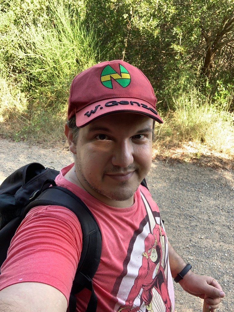 Retrato de Xavier Giner sonriente, en fondo de estantería y con camiseta de diseño lunar y espacial.